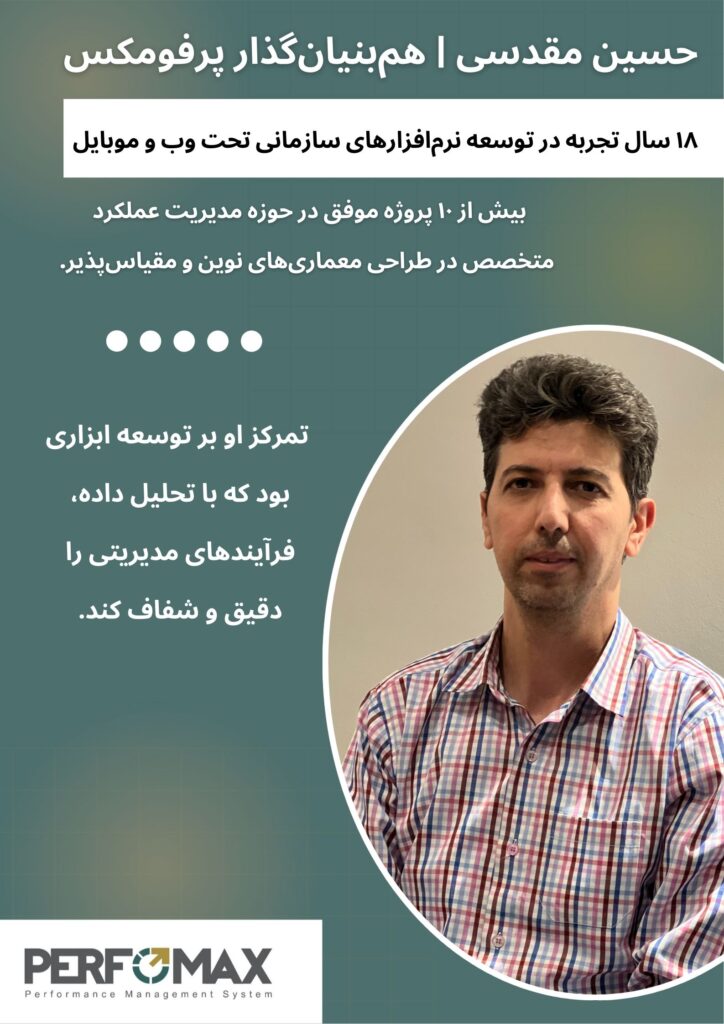 حسین مقدسی؛ برنامهنویس و توسعهدهنده نرمافزار ۱۸ سال تجریه در طراحی و پیادهسازی سیستمهای سازمانی تحت وب، موبایل. مجری پروژههای متنوعی از توسعه اپلیکیشنهای مبتنی بر زبان های برنامه نویسی روز گرفته تا طراحی معماری های نوین و مقیاسپذیر. همچنین بیش از ۱۰ تجربه موفق در پیادهسازی و راهاندازی نرمافزارهای مدیریت عملکرد که در بهبود ارزیابی کارکنان، افزایش بهرهوری و تصمیمگیریهای مدیریتی سازمانها نقش مؤثری داشته است.