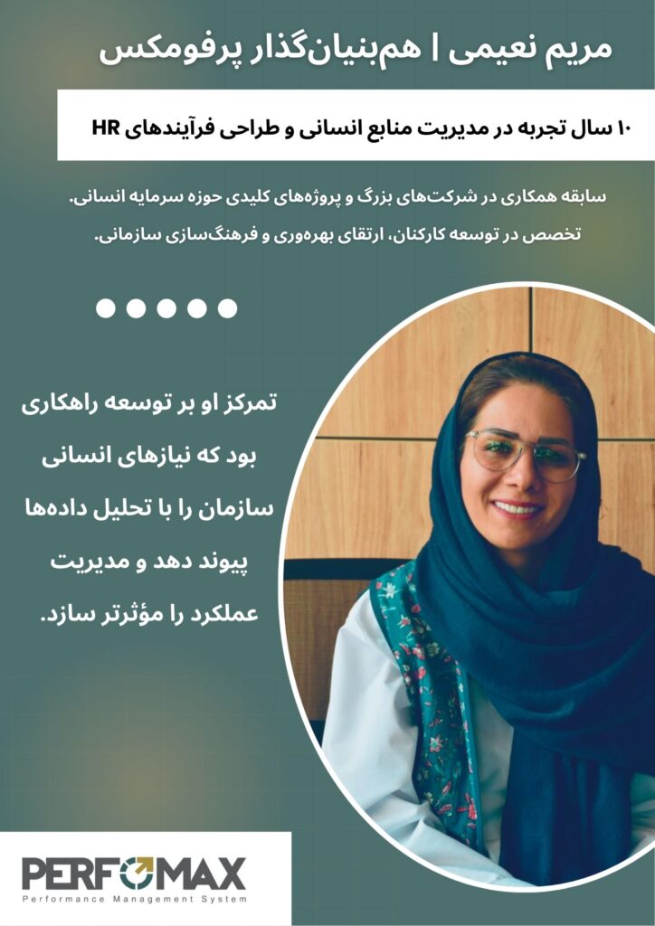 مریم نعیمی؛ متخصص منابع انسانی با بیش از ۱۰ سال تجربه در مدیریت سرمایه انسانی، طراحی و توسعه فرآیندهای سازمانی.دارای سابقه همکاری در شرکتهای داروسازی معتبر و نقشآفرینی در پروژههای کلیدی حوزه منابع انسانی شامل مدیریت عملکرد، توسعه کارکنان و ارتقاء بهرهوری سازمانی.با بهرهگیری از دانش کارشناسی ریاضی و کارشناسی ارشد مهندسی صنایع – مدیریت سیستمها و بهرهوری، توانسته است بین تحلیل دادهها، شناخت نیازهای سازمانی و پیادهسازی راهکارهای منابع انسانی پلی اثربخش ایجاد کند.